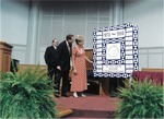 A color photograph of Dr. Dixon, his wife, and two other people on the chapel stage where Dr. Dixon is presented with a quilt honoring his service as president.